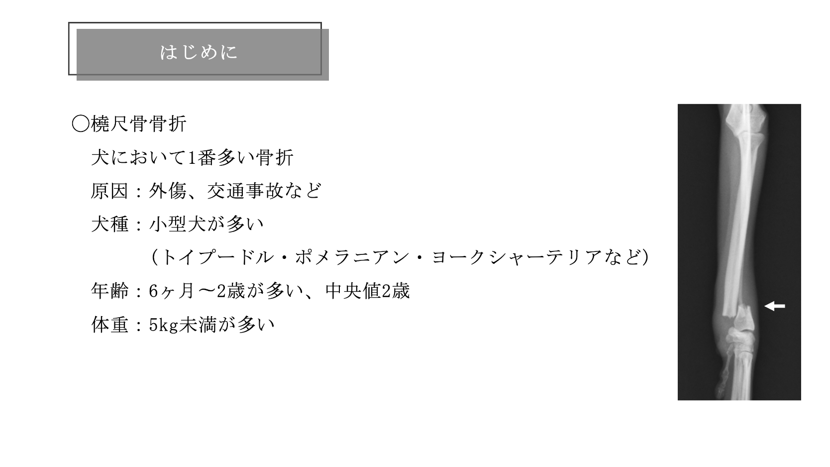 犬の橈尺骨骨折は小型犬(トイプードル・ポメラニアン・ヨークシャーテリアなど)に多く、5kg未満で多いとされています。